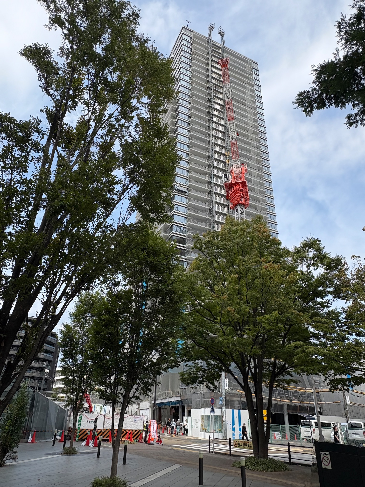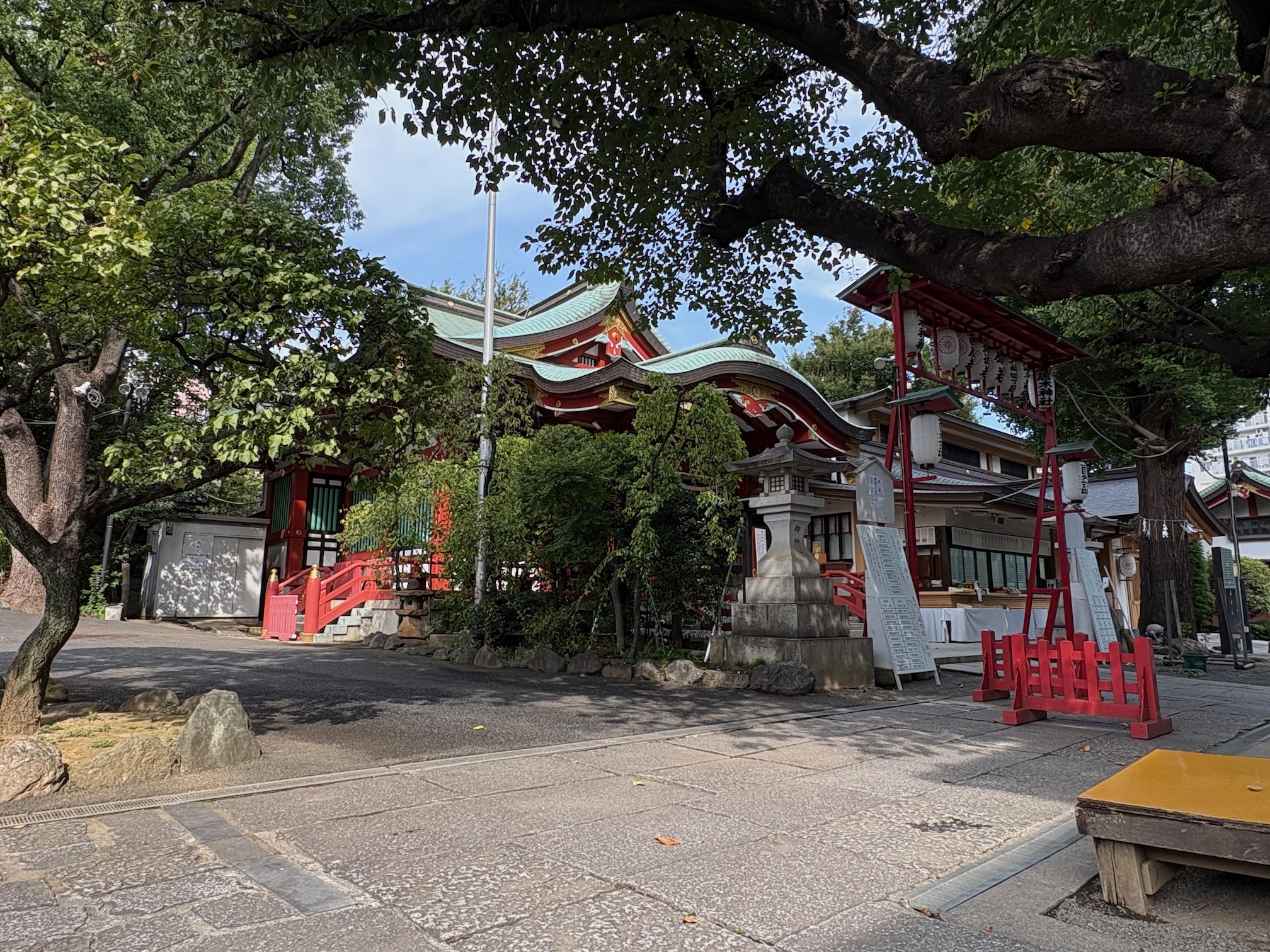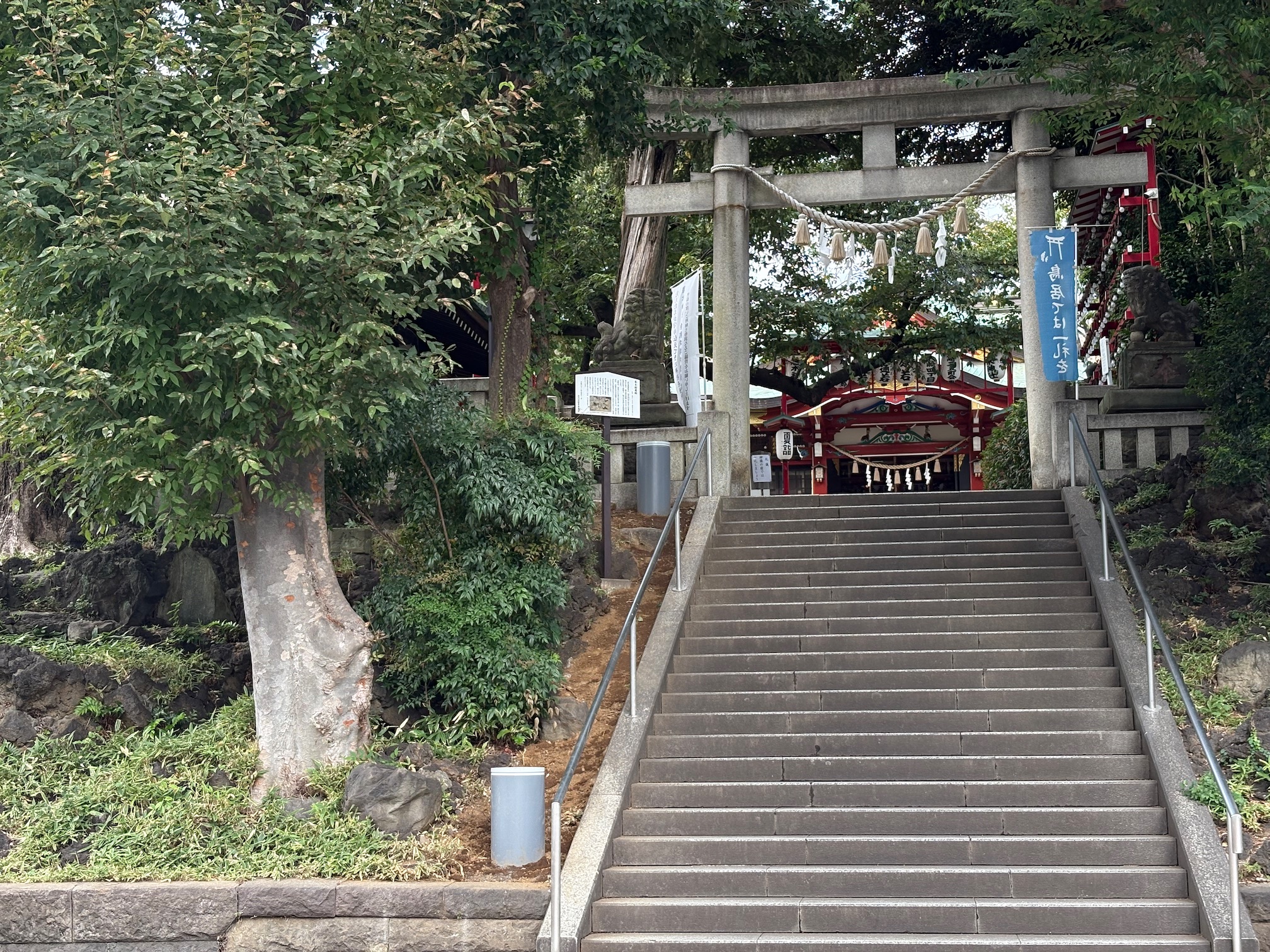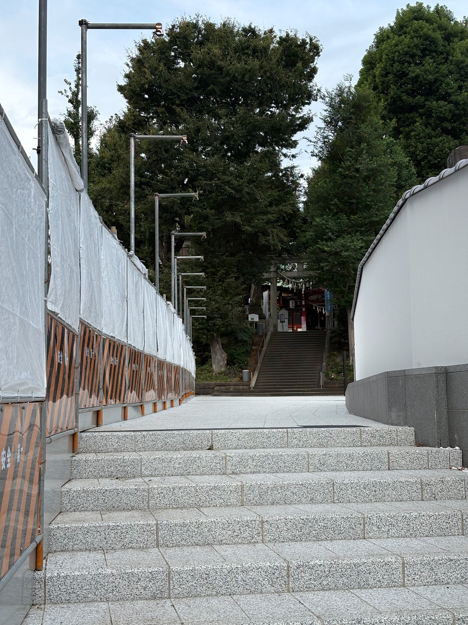 タワマンが見えます。ベビーカーや着物姿の場合は横断歩道を渡って左へ(階段を登らずに境内に行けます)、階段を登っても良い方はタワマンを右へ